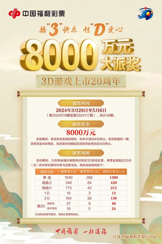 為回饋廣大購彩者對(duì)福彩3D游戲的喜愛與支持,江蘇省福利彩票發(fā)行中心決定開展2024年3D游戲8000萬元派獎(jiǎng)活動(dòng)?,F(xiàn)就有關(guān)事項(xiàng)公告如下: