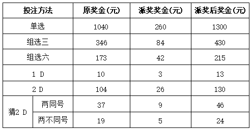 活動(dòng)期間,凡在我省福彩銷售網(wǎng)點(diǎn)購買3D游戲彩票,單票金額超過20元(含)的中獎(jiǎng)彩票均可參與派獎(jiǎng)活動(dòng),具體派獎(jiǎng)規(guī)則如下:
